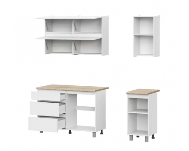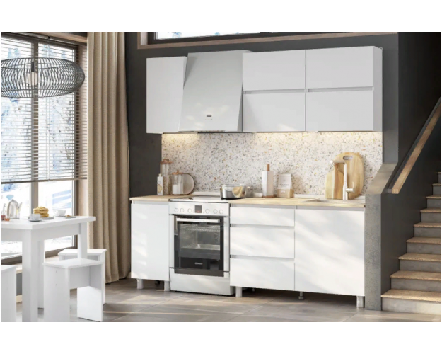 Кухонный гарнитур Токио — готовое решение для создания светлого и визуально легкого интерьера. Дверцы ящиков и шкафов не имеют лицевой фурнитуры и открываются захватом рукой за тыльный край фасада, что смотрится современно и упрощает уход за поверхностью. Столешница в оттенке натурального дерева делает гарнитур уютнее, а регулируемые опоры помогают справиться с небольшими неровностями пола.