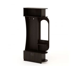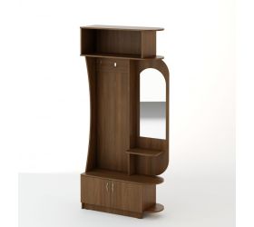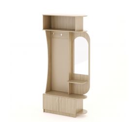 Прихожая оборудована вешалкой с крючками, секциями с открытыми и закрытыми полками. Сверху имеется полка для размещения головных уборов и шарфов. Также прихожая дополнена небольшим зеркалом, что делает её очень удобной для небольших помещений.